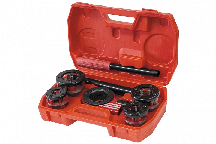 Набор клуппов для конической трубной резьбы с четырьмя быстросъемными головками: 1/2”, 3/4”, 1”, 1 1/4”.