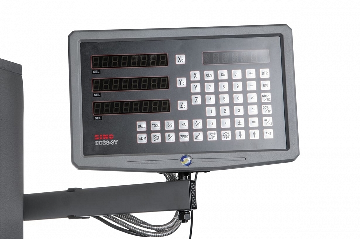 Конструкция станка имеет дополнительно устройство цифровой индикации (УЦИ) по всем трем осям X, Y, Z, позволяющее устанавливать необходимые параметры обработки, осуществлять привязку инструментов и контролировать режимы работы станка с точностью в 5 микрон. Станок оснащен автоматической подачей пиноли шпинделя, имеет 3 скорости - 0,12; 0,18; 0,25 мм/об. Наличие микрометрической подачи, позволяет установить инструмент на необходимую глубину в ручном режиме. Максимальный вылет пиноли шпинделя составляет 120 мм. Для увеличения производительности и удобства обработки крупногабаритных деталей, станок дополнительно оснащен механизированным приводом по оси Z. На пульте управления есть переключатель перемещения фрезерной головы по вертикальной стойке вверх/вниз.