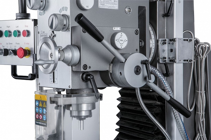 JMD-50LPFD предназначен для выполнения следующих операций: фрезерования, сверления, рассверливания, зенкования, зенкерования, развертывания и нарезания резьбы. Он оснащен шпинделем с конусом ISO30 и имеет возможность сверления отверстий до диаметра 32мм по стали и до 45мм по чугуну. Наличие реверсивного вращения электродвигателя, обеспечивает вращение шпинделя в обе стороны и позволяет осуществлять технологические операции по нарезанию резьбы.
